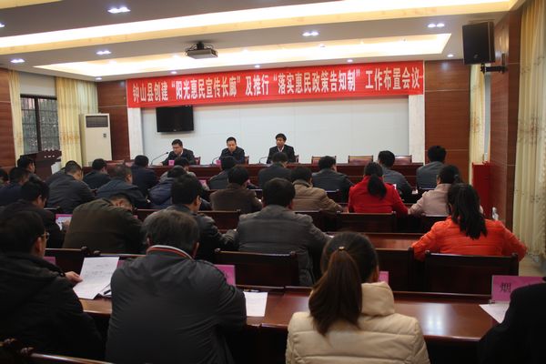 12月12日,钟山县创建“阳光惠民宣传长廊”及推行“落实惠农政策告知制”工作布置会议在县委一楼会议室召开。县委常委、县人民政府常务副县长、县纠风工作领导小组组长陈拥军出席会议,县委常委、县纪委书记韩必禄主持会议。