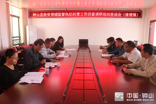 调研组首先到清塘镇政府会议室召开扶贫领域监督执纪问责工作巡查调研活动座谈会。会议听取了清塘镇主要领导对该镇扶贫领域工作情况的汇报,巡查组对清塘镇脱贫摘帽、扶贫等工作表示肯定,并强调,要认真贯彻上级会议精神,加强领导,落实责任,确保扶贫政策、扶贫资金管理使用、扶贫项目等落实到位。