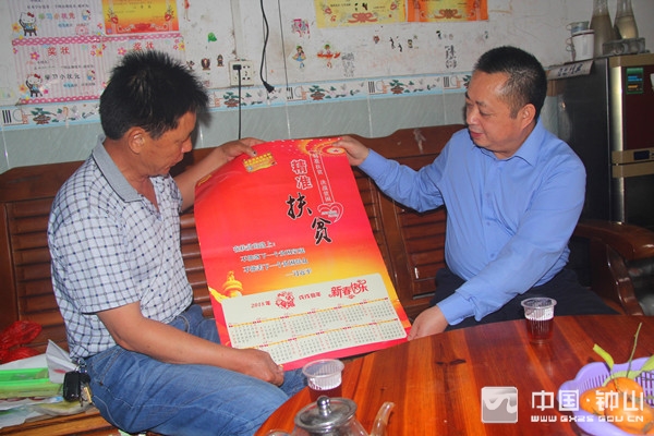 图为陈庆高(右一)给贫困户送上扶贫专项治理联系卡和精准扶贫挂历