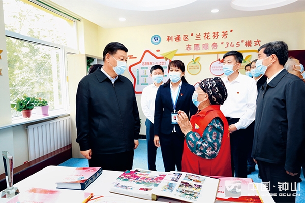 2020年6月8日至10日,中共中央总书记、国家主席、中央军委主席习近平在宁夏考察。这是6月8日下午,习近平在吴忠市利通区金花园社区党群活动服务中心,同社区志愿者代表亲切交谈。 新华社记者 鞠鹏/摄