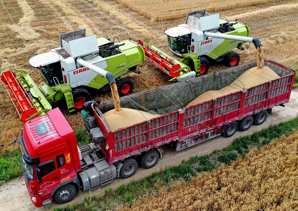 “中原粮仓”河南迎来夏粮收获季,小麦收割陆续开始。图为宝丰县龙王沟乡村振兴示范区的一处麦田,农机手正操作收割机将收获的小麦装车。新华社记者 李嘉南 摄