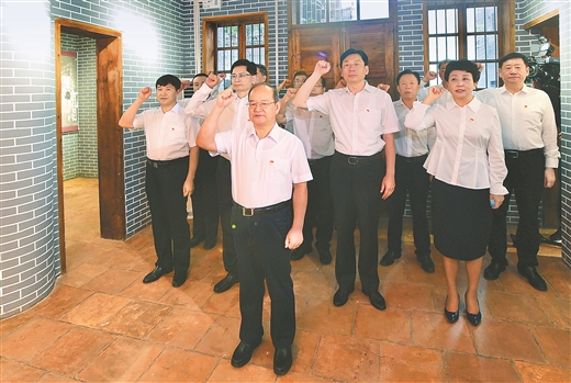 6月22日,自治区党委常委班子党史学习教育第二次专题学习、专题读书班暨自治区党委理论学习中心组2021年第三次专题学习在梧州举行。在中共广西特委旧址,面向鲜红的中国共产党党旗,鹿心社举起右拳,带领自治区党委理论学习中心组成员重温入党誓词。