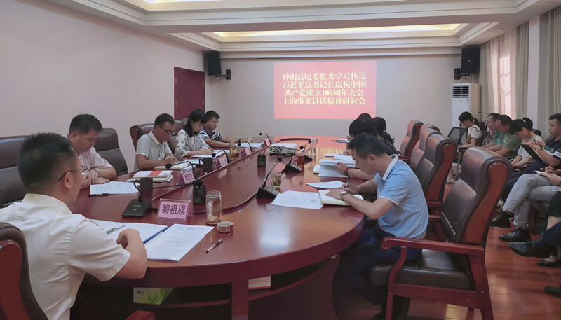 会上,黎祖旗传达学习习近平总书记在庆祝中国共产党成立100周年大会上的重要讲话精神,并结合钟山县纪检监察工作实际作了题为《坚持以人民为中心,推动新时代纪检监察工作高质量发展》专题发言。该委班子成员围绕习近平总书记“七一”重要讲话精神,结合各自分管部门工作及自身实际作了中心发言。