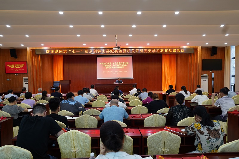 6月28日,贺州市纪委副书记、市监委副主任廖正聪到钟山县纪委监委开展领导班子联系基层党支部活动,为钟山县纪委监委党总支部的党员上了一堂丰富生动的专题党课,强调要以党史学习教育为契机,推动锻造新时代纪检监察铁军。