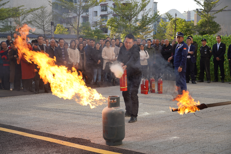 “刚刚我给大家演示了灭火器的使用步骤:提、拔、握、对、喷,现在谁先来操作一下?”消防大队人员问道。