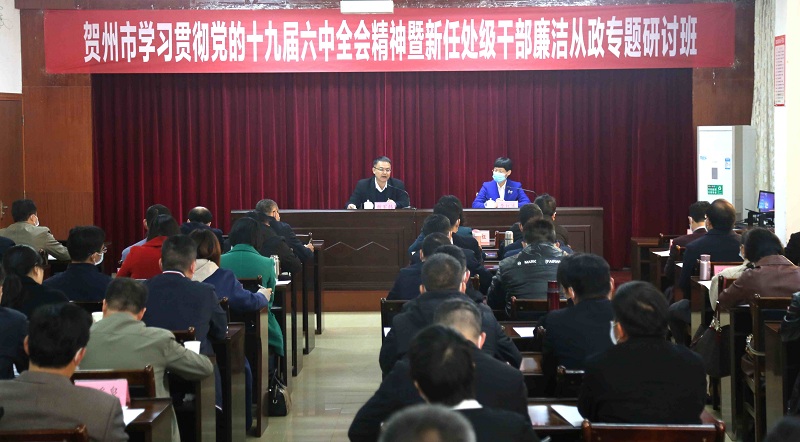 魏军韩向新任处级干部宣讲党的十九届六中全会精神,特别是习近平总书记关于党风廉政建设和反腐败工作的重要论述,以及自治区第十二次党代会精神,通报全市党的十八大以来党风廉政建设和反腐败斗争情况,让大家警钟长鸣、引以为戒、知重负重、行稳致远,为推动贺州经济社会高质量发展作出新的贡献。