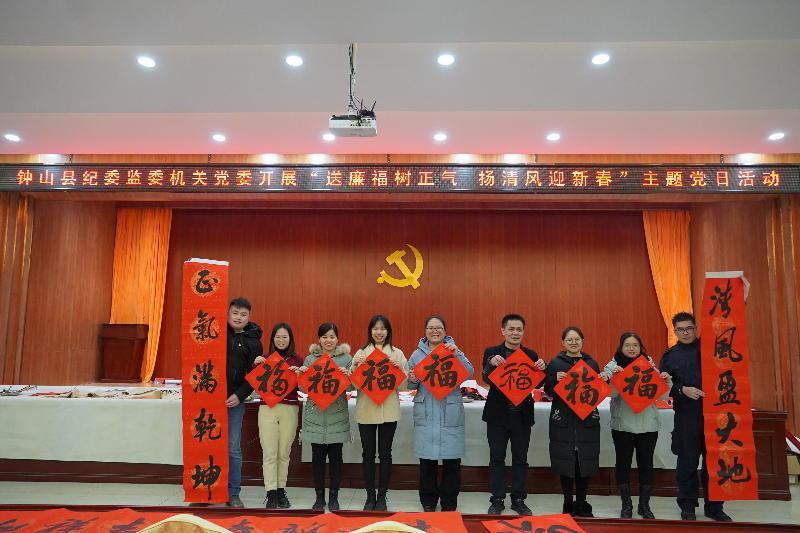 虎年新春将至,为营造吉祥如意、欢乐祥和、勤俭廉洁的新春氛围,近日,钟山县纪委监委机关党委结合党史学习教育“我为群众办实事”活动,以“结对共建”的方式,邀请回龙镇新时代文明实践所、回龙镇东凤村委书法爱好志愿者,到回龙镇东凤村委开展“送廉福树正气 扬清风迎新春”志愿服务暨主题党日活动。