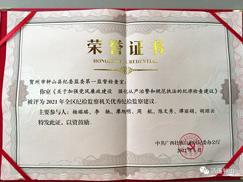 2022年6月,该份纪律检查建议荣获了全区纪检监察机关优秀纪检监察建议,主要参与人杨瑶瑶、李驰、廖旭明、周航、陈文秀、谭丽娟、胡琼云受到集体表彰。