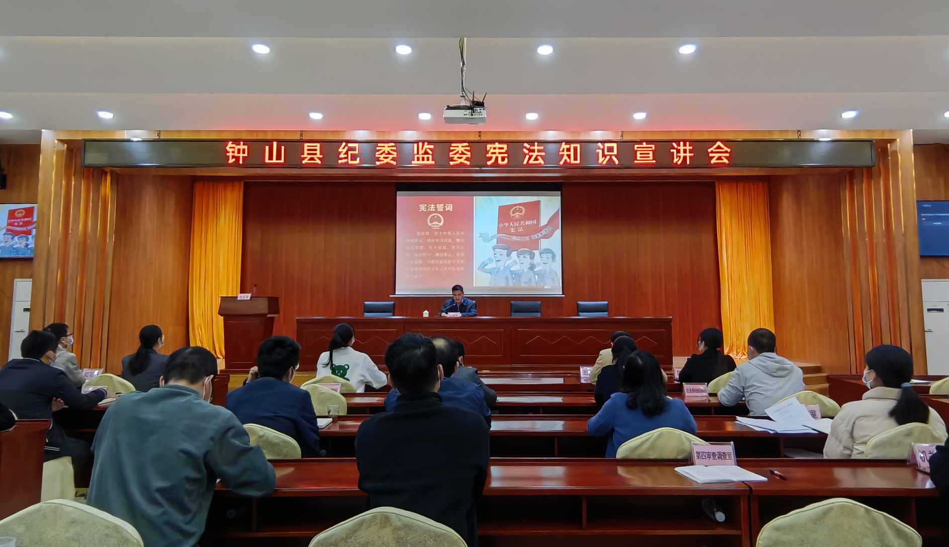 为深入学习宣传宪法,大力弘扬宪法精神,进一步促进我县法治建设,11月29日,钟山县纪委监委组织开展《宪法》知识讲座,县纪委副书记、县监委副主任杨芳宁为全体纪检监察干部上了一堂《宪法》知识讲座。