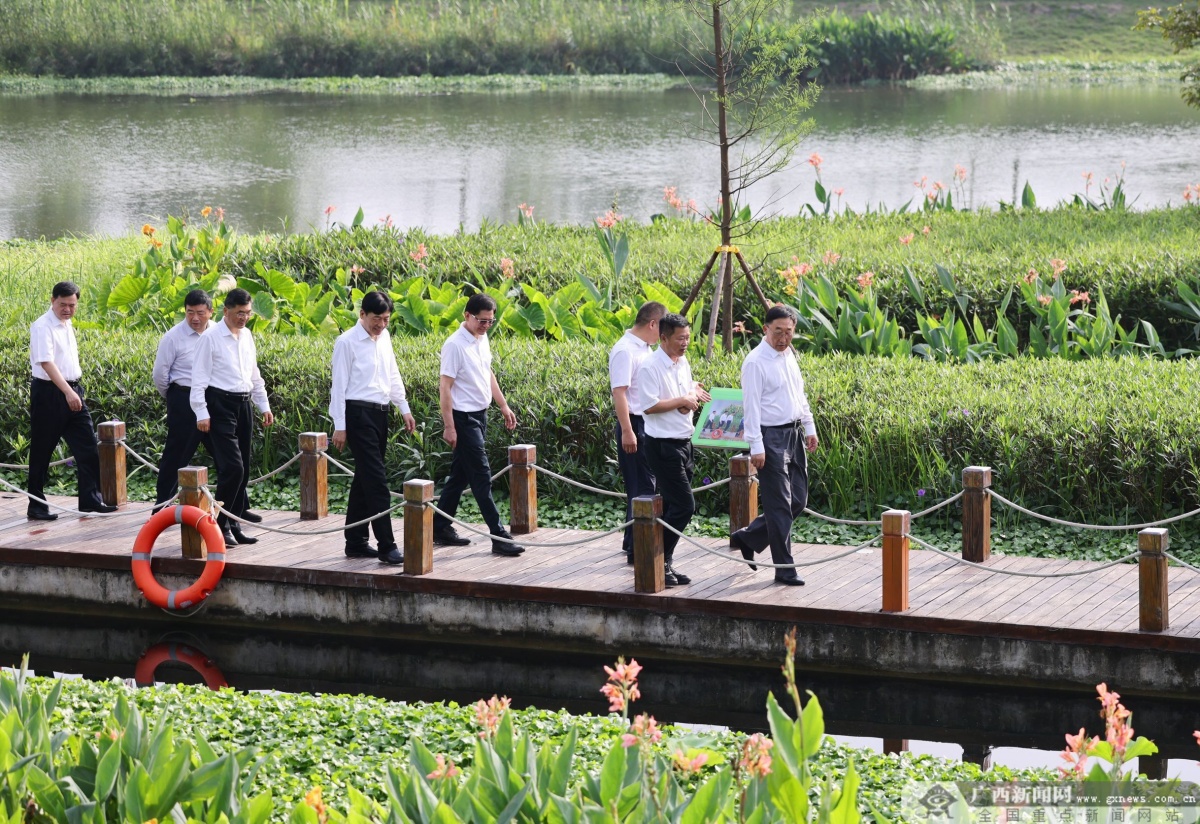 5月17日,自治区党委常委会在南宁开展“沿着习近平总书记考察足迹学思想”主题党日活动。这是自治区党委书记、自治区人大常委会主任刘宁,自治区党委副书记、自治区主席蓝天立,自治区政协主席孙大伟等沿着习近平总书记在南宁考察足迹,来到那考河生态综合治理项目,听介绍、看进展、察实效。记者 黄克 摄